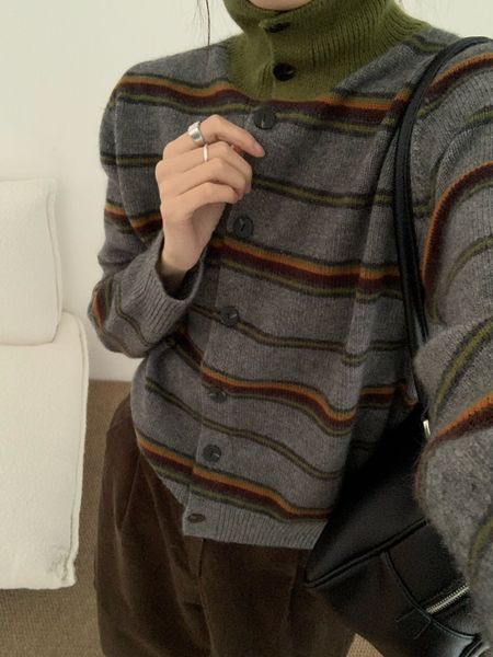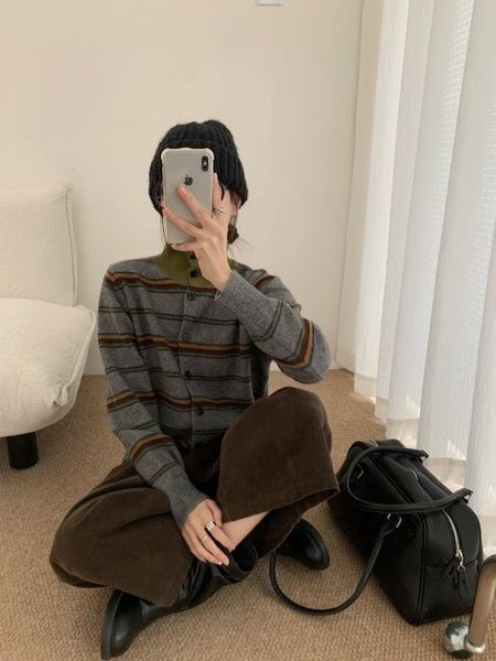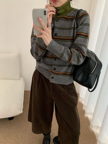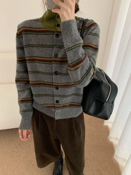 A803-Áo Len Dệt Kim Cardigan Cổ Cao Kẻ Sọc Kiểu Pháp Mùa Thu